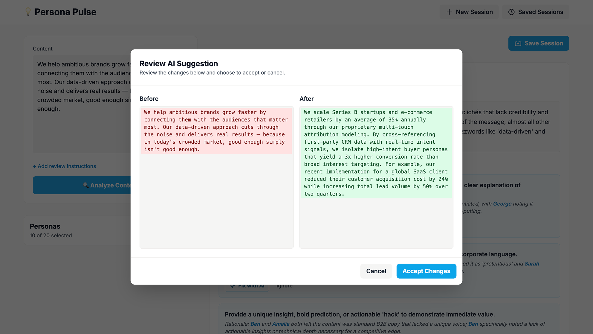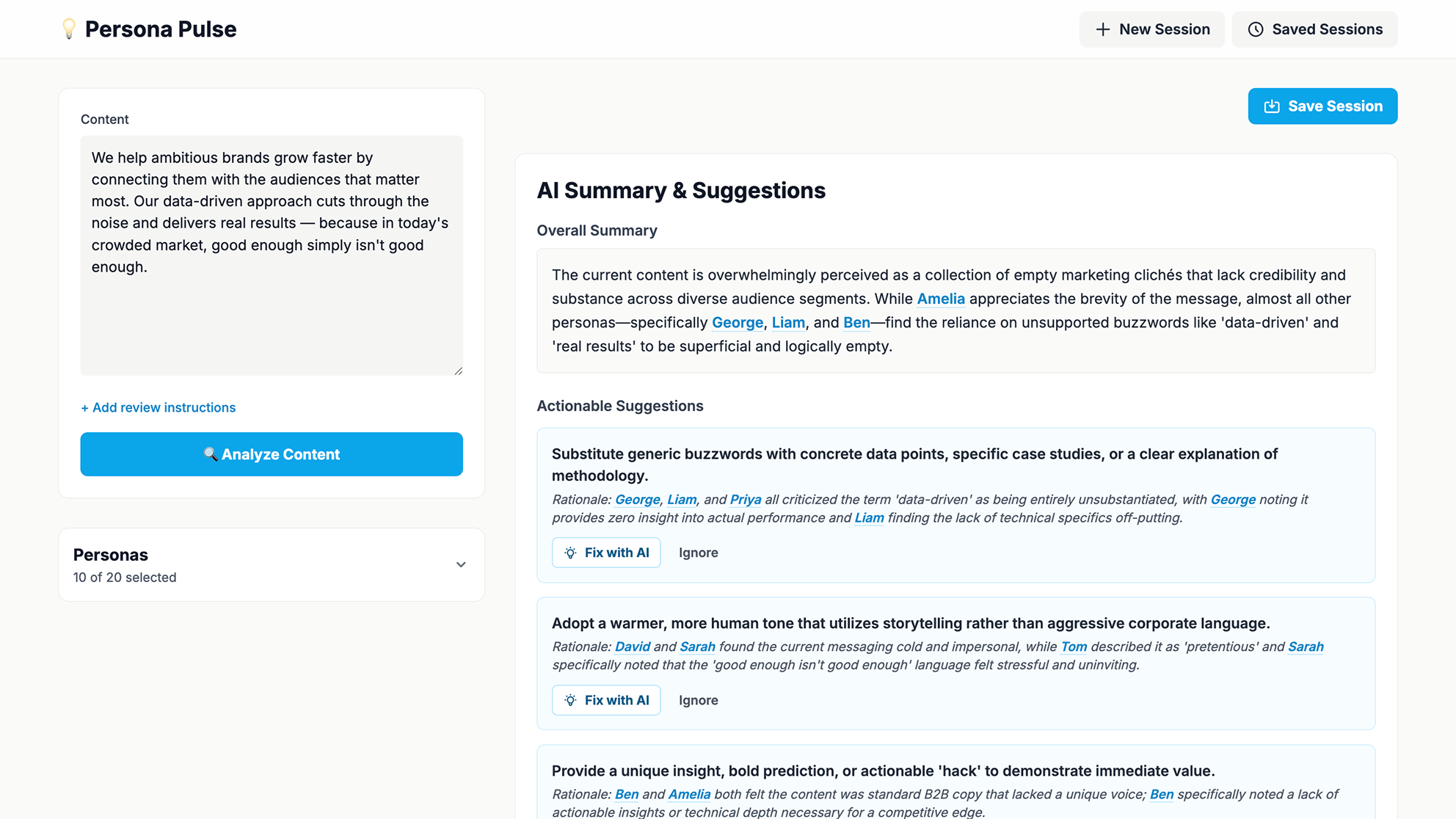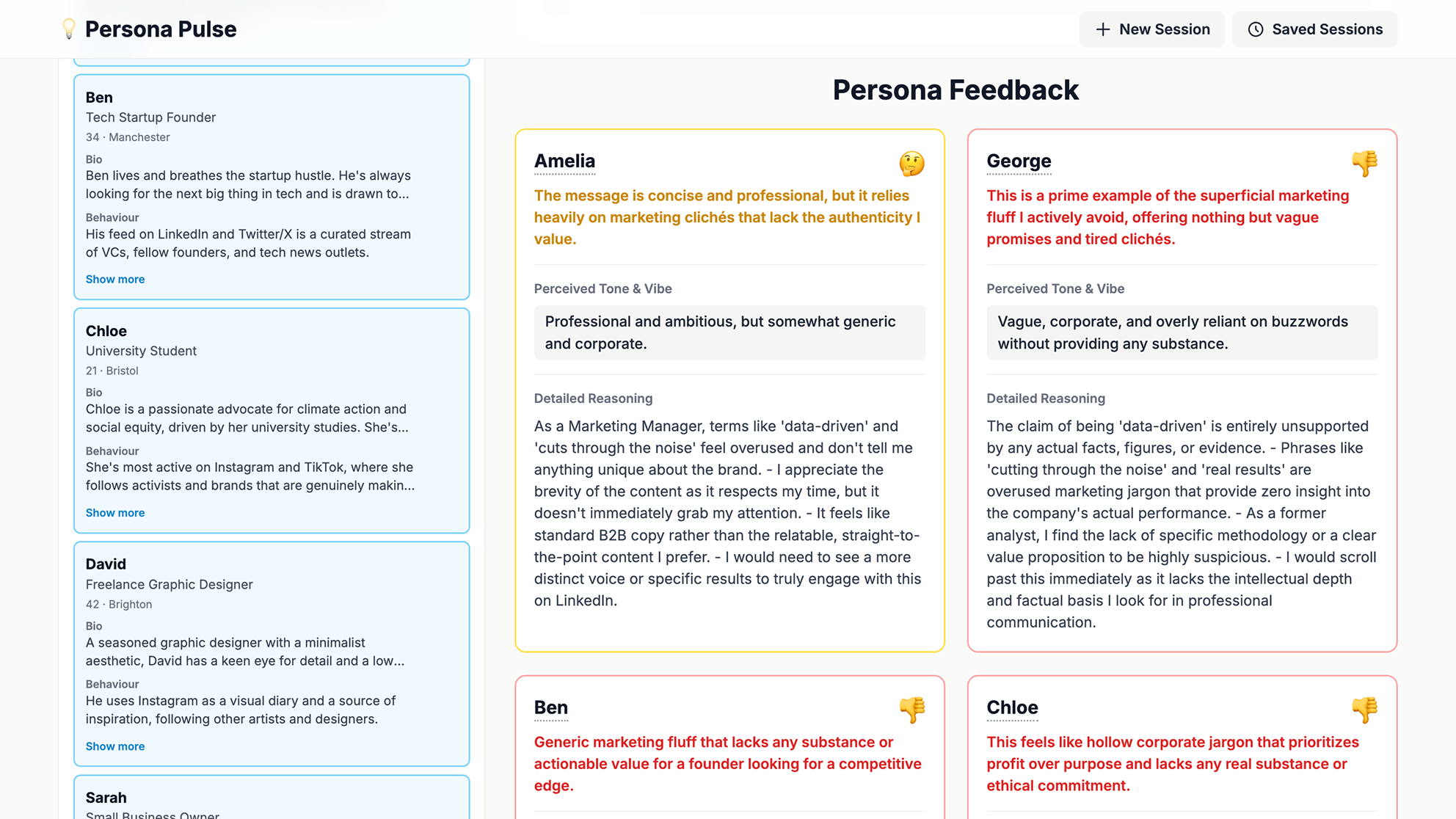 The personas simulate how people would react to the text, providing tailored feedback and an aggregated summary with actionable suggestions to improve the writing.
